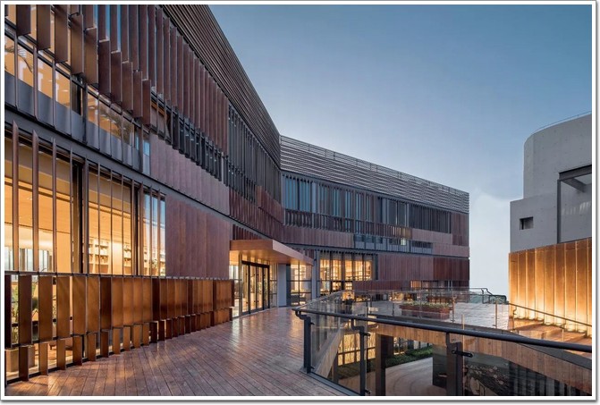 建筑形象上延續對立統一的理念,三棟建筑有著各自獨特的表現形式,但暗含著統一的建構邏輯。建筑外觀設計重在突出木材的表現力,樹葉般靈動的木格柵、厚重的木質異形幕墻,波浪一樣韻律的檐口(詞條“檐口”由行業大百科提供)格柵,無不體現木材的無限可能性。木、鋼、清水混凝土的結合設計也使空間及外表流露出濃厚的文化氣息并展現出溫暖、平易近人的建筑性格。