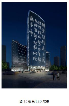 建筑設(shè)計(jì)是建筑師構(gòu)思縝密的藝術(shù)作品,每個(gè)作品都蘊(yùn)含著不同的創(chuàng)作理念,建筑立面則是設(shè)計(jì)理念的外部表現(xiàn),直接被眾人欣賞和評(píng)價(jià)。立面分格的改變無(wú)疑會(huì)影響到原創(chuàng)作品的藝術(shù)表現(xiàn)。本建筑立面所表現(xiàn)的書(shū)法藝術(shù)是書(shū)法家舒同的作品,他曾被毛澤東譽(yù)為“馬背上的詩(shī)人”。幕墻分格的調(diào)整使得動(dòng)態(tài)LED所表現(xiàn)的字體間斷,有損連續(xù)流暢的書(shū)法韻律。我們通過(guò)動(dòng)態(tài)效果的對(duì)比,與開(kāi)發(fā)商溝通后,在采光分格中間增加了一個(gè)橫框,將分格劃分為850mm-850mm-1650mm-750mm,縮小了LED點(diǎn)陣間距,避免了字體中斷(見(jiàn)右圖10)。