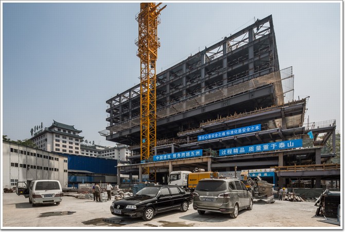 嘉德藝術中心項目位于王府井大街27號,即故宮與北京核心購物區的中間,地理位置絕佳,同時也因處于繁華地段,建筑高度有限高要求,建筑總高度為33.6米,拍賣廳置于地下,藝術中心整體建設用地面積約6311平方米,總建筑面積約55987平方米,建成后的嘉德藝術中心看上去像一個由各種鋼構件拼裝成的“鋼鐵盒子”,鋼結構施工極其復雜,總用鋼量達13610.35噸。