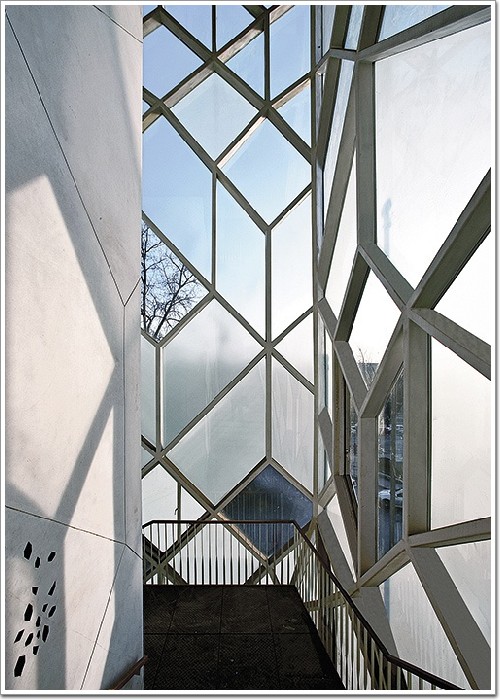 由于原有建筑層高和柱網規律性較差,設計者基于原有的結構體系確定了現有幕墻的金屬框架網格,又為對應內部功能和空間的不同,外立面選用了具有四種不同透明度的白色彩釉玻璃,作為覆蓋在外部網格上的幕墻材料,既控制著光線在建筑內外的投射和透射,也左右著人的視線在建筑內外的駐留和延伸。不均勻的透明度加上全隱框的白色彩釉玻璃幕墻,使得建筑呈現出深邃、平靜而豐富的氣質。