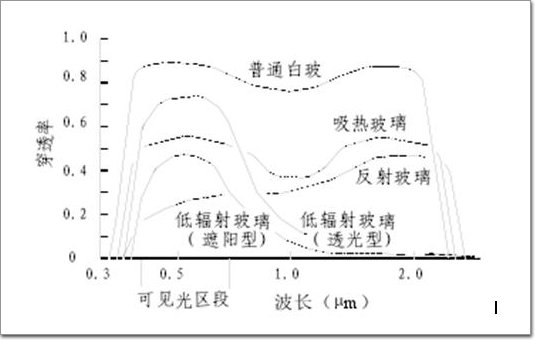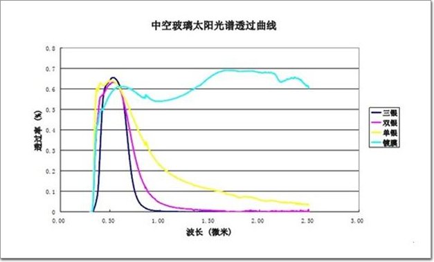 從上圖可以看出,在可見光(詞條“可見光”由行業大百科提供)(0.38-0.78微米)透過率基本相同的情況下, 幾種鍍膜玻璃的紅外線(0.78-2.5微米)透過率差異明顯。 熱反射玻璃的紅外線透過率仍很高, 單銀Low-E玻璃顯著降低, 而雙銀Low-E更低, 三銀Low-E最低,因此Low-E玻璃更加節能!