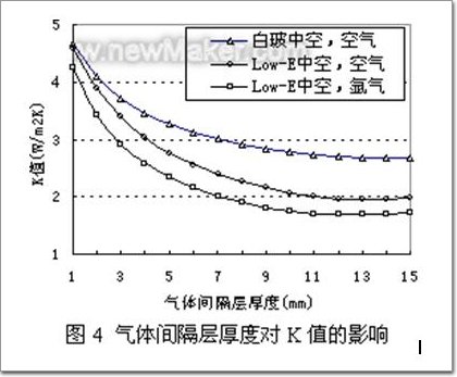 常用的中空玻璃間隔層厚度為6mm、9mm、12mm等。氣體間隔層的厚薄與傳熱阻的大小有著直接的聯系。在玻璃材質、密封構造相同的情況下,氣體間隔層越大,傳熱阻越大。但氣體層的厚度達到一定程度后,傳熱阻的增長率就很小了。因為當氣體層厚度增達到一定程度后,氣體在玻璃之間溫差的作用下就會產生一定的對流過程,從而減低了氣體層增厚的作用。如圖4所示,氣體層從1mm增加到9mm時,白玻中空充填空氣時K值下降37%,Low-E中空玻璃充填空氣時K值下降53%,充填氬氣時下降59%。從9mm增加到13mm時,下降速度都開始變緩。13mm以后,K值反而有輕微的回升。所以,對于6mm厚度玻璃中空組合,超過13mm的氣體間隔層厚度再增大不會產生明顯的節能效果。