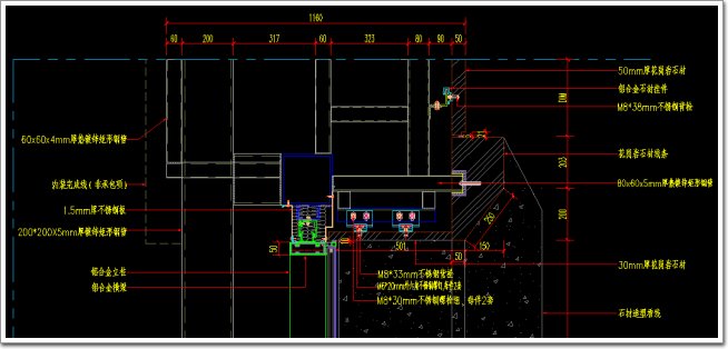 △ 首、二、三層石材柱造型(節點FS9-108所示):選用100mm厚花崗巖石材,M8不銹鋼背栓(詞條“背栓”由行業大百科提供)連接