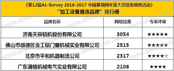 針對門窗加工設備行業內數十家企業的抽樣調查及展示,結合網絡投票與專家評選結果。