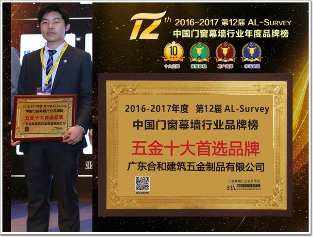 此外,在全國鋁門窗幕墻行業年會其間,還舉行了由中國建筑金屬結構協會主辦,中國幕墻網ALwindoor.com承辦的“第十二屆AL-Survey2016-2017中國幕墻網年度大型讀者調查暨‘我最喜愛幕墻工程’評選活動”的頒獎儀式,該活動自2005年創立以來,迄今已連續舉辦12屆,堅持“沒有黑馬,實至名歸”的評選風格,已成為廣大房地產開發商、設計院以及行業專家、顧問咨詢公司等讀者群體進行品牌選擇和產品選購的重要參考依據。而每屆的“我最喜愛幕墻工程”評選,更是以其“新、奇、高、大”的入圍標準,被喻為“魯班獎”的前哨站,而合和亦不負眾望獲得五金十大首選品牌大獎。
