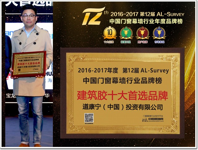 此外,在全國鋁門窗幕墻行業年會其間,還舉行了由中國建筑金屬結構協會主辦,中國幕墻網ALwindoor.com承辦的“第十二屆AL-Survey2016-2017中國幕墻網年度大型讀者調查暨‘我最喜愛幕墻工程’評選活動”的頒獎儀式,該活動自2005年創立以來,迄今已連續舉辦12屆,堅持“沒有黑馬,實至名歸”的評選風格,已成為廣大房地產開發商、設計院以及行業專家、顧問咨詢公司等讀者群體進行品牌選擇和產品選購的重要參考依據。而每屆的“我最喜愛幕墻工程”評選,更是以其“新、奇、高、大”的入圍標準,被喻為“魯班獎”的前哨站,道康寧在本次評選中,以89622張選票并結合專家評審結果最終摘得建筑膠十大首選品牌大獎,這對于一個來自于美國的品牌來說,在中國取得如此驕人的成績這與產品本身和廣大消費群體的共同認可是分不開的。