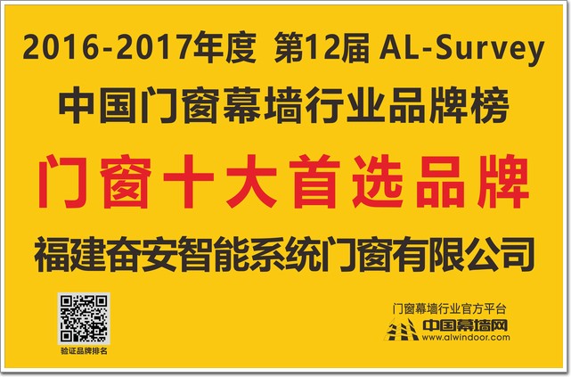 此外,在全國鋁門窗幕墻行業(yè)年會其間,還舉行了由中國建筑金屬結(jié)構(gòu)協(xié)會主辦,中國幕墻網(wǎng)ALwindoor.com承辦的“第十二屆AL-Survey2016-2017中國幕墻網(wǎng)年度大型讀者調(diào)查暨‘我最喜愛幕墻工程’評選活動”的頒獎儀式,該活動自2005年創(chuàng)立以來,迄今已連續(xù)舉辦12屆,堅持“沒有黑馬,實至名歸”的評選風格,已成為廣大房地產(chǎn)開發(fā)商、設(shè)計院以及行業(yè)專家、顧問咨詢公司等讀者群體進行品牌選擇和產(chǎn)品選購的重要參考依據(jù)。而每屆的“我最喜愛幕墻工程”評選,更是以其“新、奇、高、大”的入圍標準,被喻為“魯班獎”的前哨站,奮安集團以22741張選票的超高人氣和高口碑值,以及得來自行業(yè)專家、幕墻設(shè)計院和顧問公司20名專業(yè)評委的高度評價,最終榮獲門窗十大首選品牌大獎。
