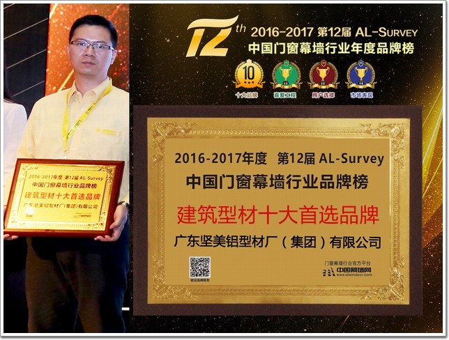 在全國鋁門窗幕墻行業年會其間,舉行了由中國建筑金屬結構協會主辦,中國幕墻網ALwindoor.com承辦的“第十二屆AL-Survey2016-2017中國幕墻網年度大型讀者調查暨‘我最喜愛幕墻工程’評選活動”的頒獎儀式,該活動自2005年創立以來,迄今已連續舉辦12屆,堅持“沒有黑馬,實至名歸”的評選風格,已成為廣大房地產開發商、設計院以及行業專家、顧問咨詢公司等讀者群體進行品牌選擇和產品選購的重要參考依據。而每屆的“我最喜愛幕墻工程”評選,更是以其“新、奇、高、大”的入圍標準,被喻為“魯班獎”的前哨站,在此次行業最大的盛會中,堅美以32315票一舉拿下建筑型材十大首選品牌大獎冠軍,算是對過去的一年堅美人所付出來努力和汗水交上了一份完美的答卷。