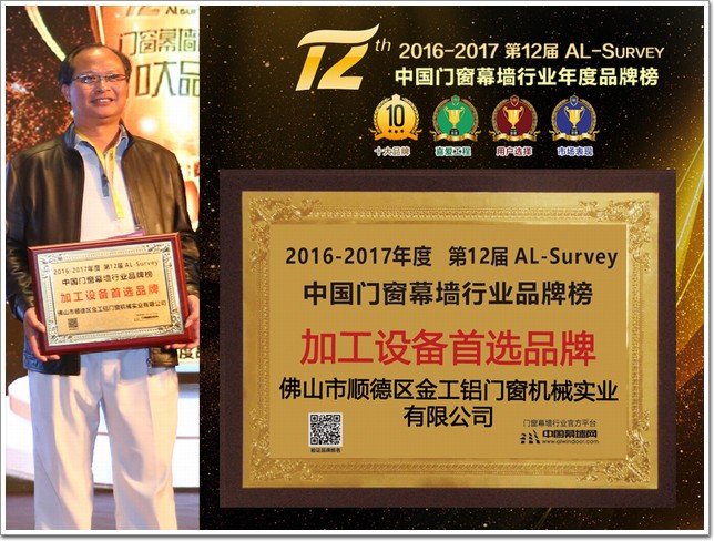 此外,在全國鋁門窗幕墻行業年會其間,還舉行了由中國建筑金屬結構協會主辦,中國幕墻網ALwindoor.com承辦的“第十二屆AL-Survey2016-2017中國幕墻網年度大型讀者調查暨‘我最喜愛幕墻工程’評選活動”的頒獎儀式,該活動自2005年創立以來,迄今已連續舉辦12屆,堅持“沒有黑馬,實至名歸”的評選風格,已成為廣大房地產開發商、設計院以及行業專家、顧問咨詢公司等讀者群體進行品牌選擇和產品選購的重要參考依據。而每屆的“我最喜愛幕墻工程”評選,更是以其“新、奇、高、大”的入圍標準,被喻為“魯班獎(詞條“魯班獎”由行業大百科提供)”的前哨站,而金工機械亦不負眾望,以2515票斬獲加工設備類首選品牌大獎。