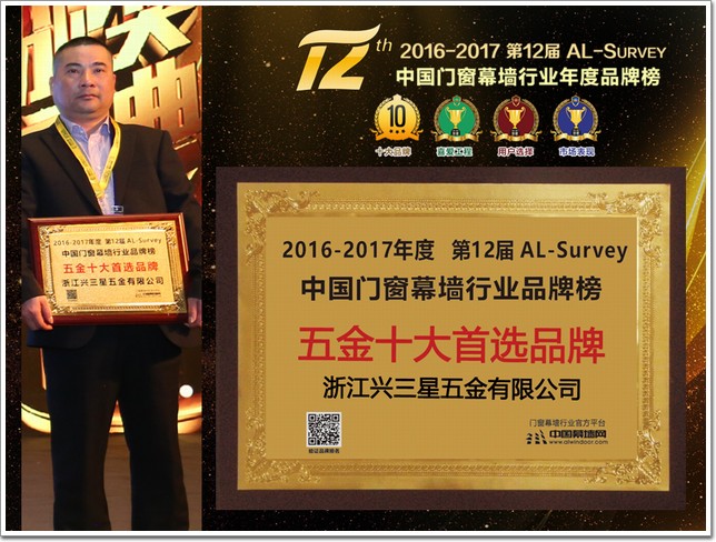 此外,在全國鋁門窗幕墻行業(yè)年會(huì)其間,還舉行了由中國建筑金屬結(jié)構(gòu)協(xié)會(huì)主辦,中國幕墻網(wǎng)ALwindoor.com承辦的“第十二屆AL-Survey2016-2017中國幕墻網(wǎng)年度大型讀者調(diào)查暨‘我最喜愛幕墻工程’評(píng)選活動(dòng)”的頒獎(jiǎng)儀式,該活動(dòng)自2005年創(chuàng)立以來,迄今已連續(xù)舉辦12屆,堅(jiān)持“沒有黑馬,實(shí)至名歸”的評(píng)選風(fēng)格,已成為廣大房地產(chǎn)開發(fā)商、設(shè)計(jì)院以及行業(yè)專家、顧問咨詢公司等讀者群體進(jìn)行品牌選擇和產(chǎn)品選購的重要參考依據(jù)。而每屆的“我最喜愛幕墻工程”評(píng)選,更是以其“新、奇、高、大”的入圍標(biāo)準(zhǔn),被喻為“魯班獎(jiǎng)(詞條“魯班獎(jiǎng)”由行業(yè)大百科提供)”的前哨站,興三星五金最終以34821票強(qiáng)勢(shì)奪得“五金十大首選品牌”大獎(jiǎng)。