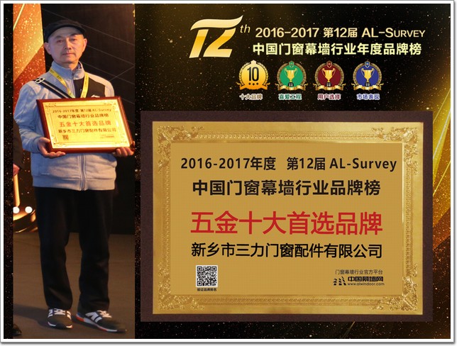 此外,在全國鋁門窗幕墻行業年會其間,還舉行了由中國建筑金屬結構協會主辦,中國幕墻網ALwindoor.com承辦的“第十二屆AL-Survey2016-2017中國幕墻網年度大型讀者調查暨‘我最喜愛幕墻工程’評選活動”的頒獎儀式,該活動自2005年創立以來,迄今已連續舉辦12屆,堅持“沒有黑馬,實至名歸”的評選風格,已成為廣大房地產開發商、設計院以及行業專家、顧問咨詢公司等讀者群體進行品牌選擇和產品選購的重要參考依據。而每屆的“我最喜愛幕墻工程”評選,更是以其“新、奇、高、大”的入圍標準,被喻為“魯班獎”的前哨站,在本次評選中,新鄉三力亦不負眾望以33536超高選票在眾多五金企業中脫穎而出獲得五金十大首選品牌大獎。