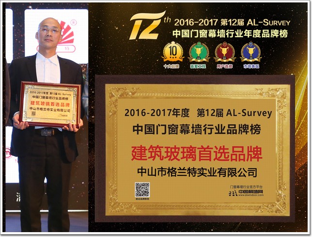 此外,在全國鋁門窗幕墻行業年會其間,還舉行了由中國建筑金屬結構協會主辦,中國幕墻網ALwindoor.com承辦的“第十二屆AL-Survey2016-2017中國幕墻網年度大型讀者調查暨‘我最喜愛幕墻工程’評選活動”的頒獎儀式,該活動自2005年創立以來,迄今已連續舉辦12屆,堅持“沒有黑馬,實至名歸”的評選風格,已成為廣大房地產開發商、設計院以及行業專家、顧問咨詢公司等讀者群體進行品牌選擇和產品選購的重要參考依據。而每屆的“我最喜愛幕墻工程”評選,更是以其“新、奇、高、大”的入圍標準,被喻為“魯班獎”的前哨站,在此次評選中,格蘭特以9453票以及20位專家評審的重重篩選,最終奪得2016-2017年度大型讀者調查暨‘我最喜愛幕墻工程’建筑玻璃類首選品牌大獎。