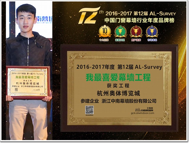 2017年3月10日,由中國建筑金屬結(jié)構(gòu)協(xié)會主辦,中國幕墻網(wǎng)承辦的第12屆AL-Survey(詞條“AL-Survey”由行業(yè)大百科提供) 2016-2017年度大型讀者調(diào)查活動暨“我最喜愛幕墻工程”評選活動(簡稱:AL-Survey)頒獎儀式在廣州富力君悅大酒店隆重舉行,由浙江中南幕墻股份有限公司承建的杭州奧體博覽城項目自2016年9月開始征集本次活動以來,備受業(yè)界關(guān)注,在歷經(jīng)半年的層層篩選后,該項目成功入圍第12屆AL-Survey 2016-2017年度 “我最喜愛幕墻工程”類獎項,并最終以46015的高票數(shù)獲得“我最喜愛幕墻工程”獎。