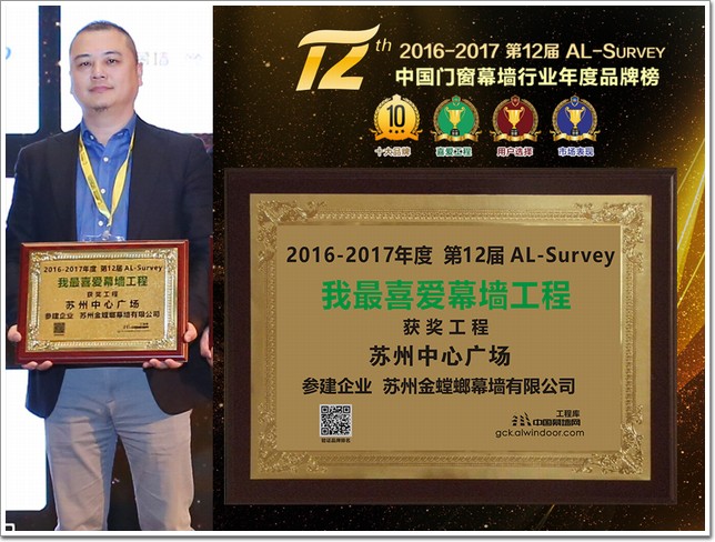 2017年3月10日,由中國建筑金屬結構協會主辦,中國幕墻網承辦的第12屆AL-Survey 2016-2017年度大型讀者調查活動暨“我最喜愛幕墻工程”評選活動(簡稱:AL-Survey)頒獎儀式在廣州富力君悅大酒店隆重舉行,由蘇州金螳螂承建的蘇州中心廣場項目在歷經半年的層層篩選后,該項目最終榮獲 “我最喜愛幕墻工程”類獎項。