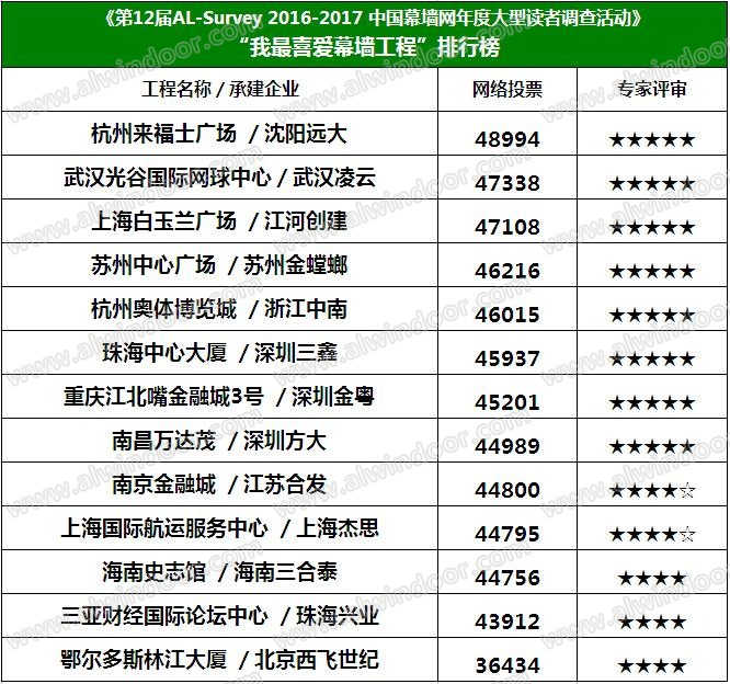 AL-Survey調(diào)查活動(dòng),從2005年9月開(kāi)始,至今已經(jīng)是第12屆。堅(jiān)持“沒(méi)有黑馬,實(shí)至名歸”的評(píng)選風(fēng)格,已成為廣大房地產(chǎn)開(kāi)發(fā)商、設(shè)計(jì)院以及行業(yè)專家、顧問(wèn)咨詢公司等讀者群體進(jìn)行品牌選擇和產(chǎn)品選購(gòu)的重要參考依據(jù)。而每屆的“我最喜愛(ài)幕墻工程”評(píng)選,更是以其“新、奇、高、大”的入圍標(biāo)準(zhǔn),被喻為“魯班獎(jiǎng)”的前哨站。