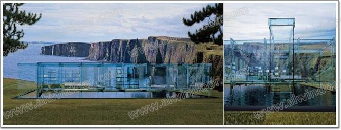 建于水面上的長方形吊腳式玻璃屋,由兩片玻璃組成的玻璃Ⅱ型柱子穿過水面,與地基連接,離水面一定高度處,建立一層梁網格,交接處通過玻璃耳板用螺栓進行連接。玻璃地面鋪在梁網格上面,玻璃屋頂做法與樓板相似。入口樓梯道由兩塊到地基的玻璃面板做為主梁,樓梯踏板與玻璃面板連接,頂部由從屋內延伸出來的玻璃梁作為主支撐架,玻璃墻面板與屋面板與之連接。