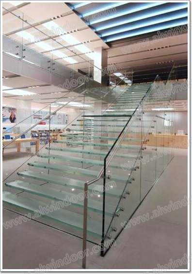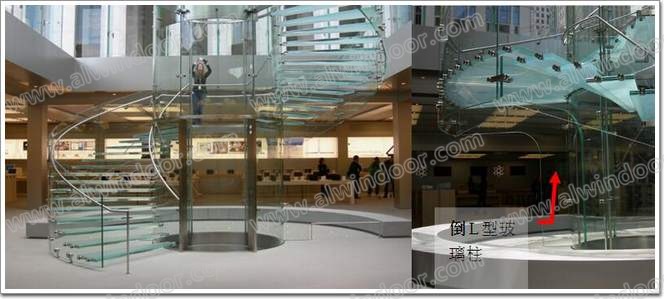 2004年在日本大阪蘋果專賣店建成的螺旋形玻璃樓梯,由高承受力的夾層化學鋼化圓弧玻璃通過鋼件連接成螺旋形的承載欄河(即樓梯的主梁),通過鋼索吊掛在上部梁上。玻璃踏面選用浮法玻璃,兩端使用鋼件與玻璃欄河連接,形成一個整體共同抵抗當地多發的高烈度地震作用。