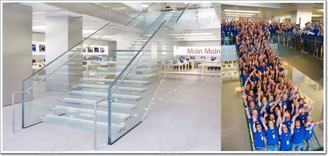 2012年倫敦王子街103號的蘋果旗艦店重新裝修,玻璃樓梯重新設計成跨度13m的新一代玻璃樓梯,跨度13m的玻璃欄河為一塊5層夾膠半鋼化玻璃,重量超過2噸。