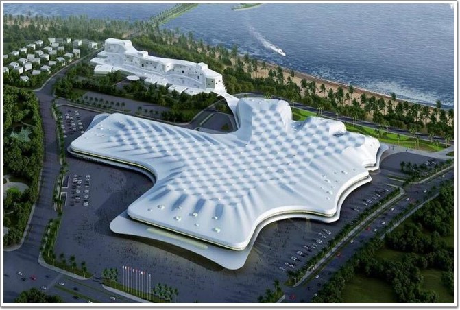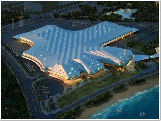 項目設計團隊是2008年北京奧運會“鳥巢”設計團隊---中國建筑設計研究院設計大師李興鋼先生執掌設計,外觀設計上結合建筑外部造型,充分考慮沿海建筑景觀,在總體布局和功能安排上融入海南獨特的熱帶濱海風情和海洋文化元素,整體形似一只展翅的大鵬,又似一個來自海底世界古老生物的建筑座落于海口西海岸,主屋頂整體呈波浪型,規則韻律、連綿起伏,整體建筑造型新穎、獨特,具有獨創性、標志性和高品位。