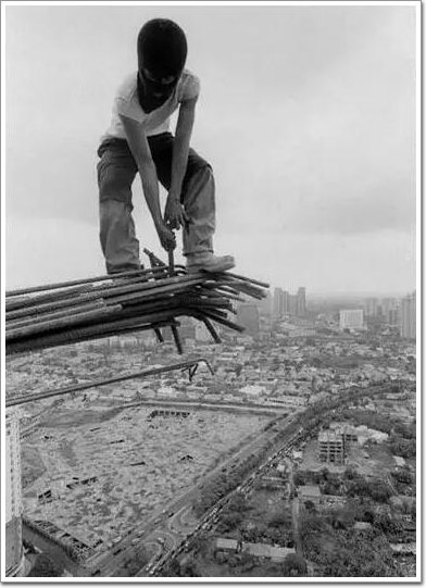 在高空綁鋼筋的建筑工人,一只腳只是踩著一根支出去的鋼筋,很明顯的沒有帶安全帶,看著著實危險。