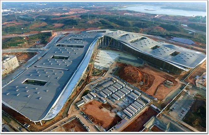 不僅如此,該項目一期工程在設計展館時,采用了“無柱設計”。從項目的整體格局上看很像機場航站樓,由A至H共八個展館、16個廳構成,一眼望去,延綿約1.3公里的象牙白金屬屋頂和高聳達數十米的全玻幕墻共同構成簡約而磅礴的“V”字形。屋頂潔凈平滑、曲線柔美,猶如層層波浪在高空起伏,由于金屬屋面的功能齊備,具有節能、保溫、通風、收集雨水以二次利用等功能,因此整個金屬屋面的結構也相對復雜,有保溫層、隔音層等材料16層之多,由于內部填充了保溫棉等軟質地材料,且金屬層本身具有非常強大的變形恢復能力,即加載過程中產生的應變會隨著重力的卸載而重新復位,所以整個屋面踩上去像就海棉一樣柔軟。空間顯得非常寬闊大氣。