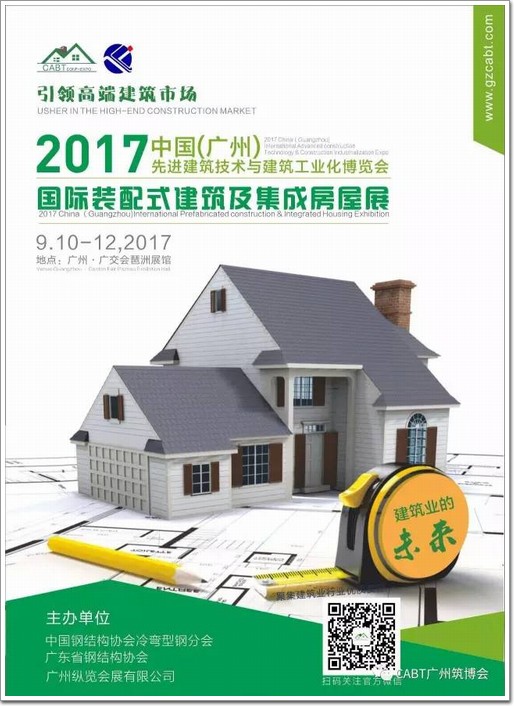 由中國鋼結構協會冷彎型鋼分會、廣東省鋼結構協會、廣東現代建筑工業化產業技術創新聯盟、廣州縱覽會展有限公司等單位聯合舉辦的“2017廣州先進建筑技術與建筑工業化博覽會”簡稱:中國筑博會(英文縮寫:CABT)定于2017年9月10-12日在廣州廣交會琶洲展館舉行,展會將同期舉辦“2017中國國際裝配式建筑高峰論壇”(主題論壇)、“第二屆中國國際冷彎型鋼博覽會”等展覽及會議,旨在推動建筑裝配化、集成化、工業化,促進行業技術交流和先進建筑技術的大力發展。