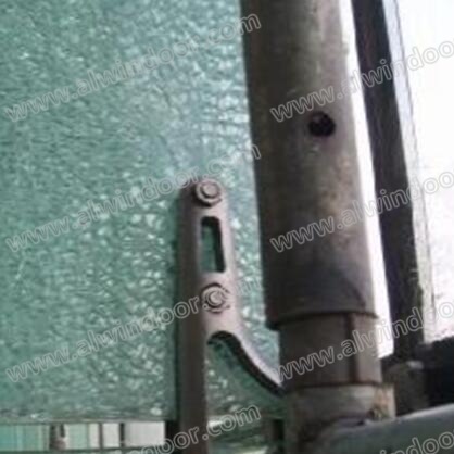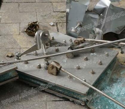 圖5、圖6中所示的是某些駁接玻璃肋支承點支式玻離幕墻在安裝或使用中的肋玻璃大面積破損照片;圖7是無框玻璃門上的水平玻璃肋與豎向玻璃肋連接不當引起的玻璃肋爆裂;圖8至圖10中所示的是駁接玻璃肋支承點支式玻離幕墻在玻璃肋連接節點和肋與面板連接節點設計不當而引起的玻璃爆裂情況。