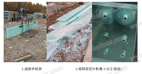 如圖1~3所示,山東某幕墻工程,玻璃在運(yùn)輸過(guò)程中就已經(jīng)破碎,在搬運(yùn)、安裝過(guò)程中又相繼破碎。現(xiàn)場(chǎng)勘查發(fā)現(xiàn)玻璃加工粗糙,玻璃的邊緣沒(méi)有經(jīng)過(guò)精細(xì)打磨。夾膠玻璃在破碎后玻璃與SGP膠片脫離,這種情況很可能是SGP膠片含水率過(guò)高,或是在高壓釜(詞條“高壓釜”由行業(yè)大百科提供)中高壓恒溫時(shí)間不夠所致。