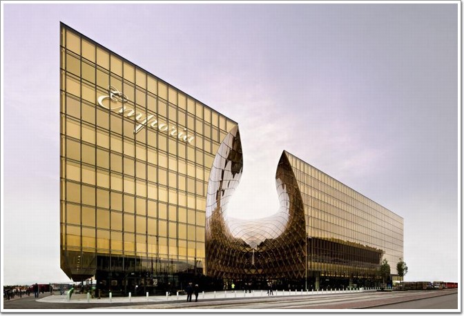 建筑物由玻璃幕墻和金屬(詞條“金屬”由行業大百科提供)架構成,在建筑設計上,整體外形全部采用金色玻璃幕墻,整個造型真的可以用凹凸有致來形容,其夸張的造型使得每塊玻璃都帶有一定的曲線,并有對應的詳細參數。采用的一系列拱頂造型呈現出青銅赭石的色調,頗似萬神廟的神韻。入口處采用雙曲面玻璃幕墻覆呈對角線覆蓋,并從這個缺口視覺追逐著厄勒海峽陽光下快速變幻的云層,倒映著海峽的天氣,撥云見日般的呈現出來,非常真實。