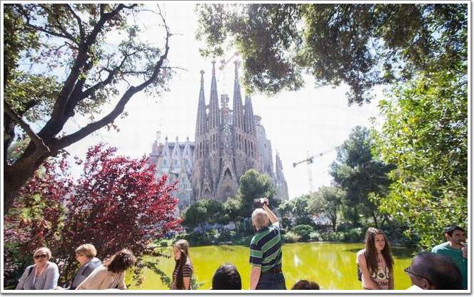 圖為游客們在圣家族大教堂前拍照留念