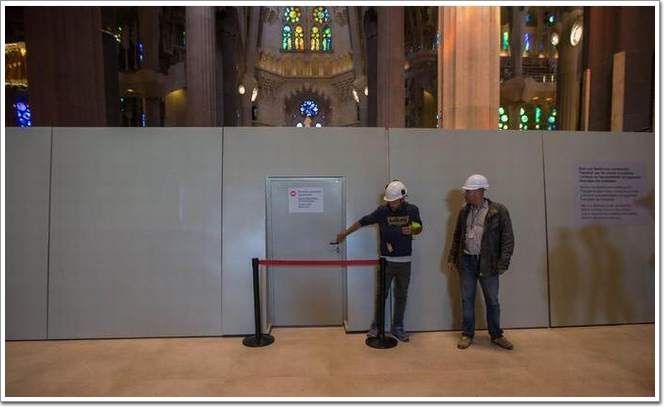圖為走進教堂內(nèi),兩名工人剛下班,準備離開。圣家族大教堂始建于1882年,西班牙著名建筑師高迪于1883年接手主持工程,融入自己的建筑設(shè)計風(fēng)格進行建設(shè)。高迪將他的晚年都投入到了教堂的建設(shè)中,直至73歲(1926年)去世時,教堂僅完工了不到四分之一。