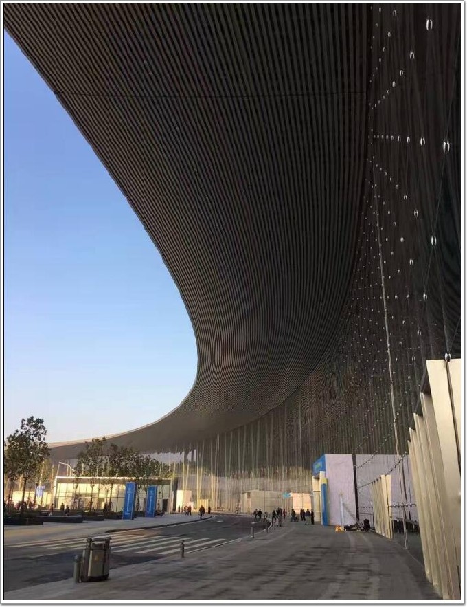 2014年12月5日,江河與綠地會展項目牽手合作,負責項目的金屬屋面工程和幕墻工程,施工面積高達近30萬平方米,其中金屬屋面25.9萬平方米、幕墻3.38萬平方米。作為綠地國際博覽城項目率先啟動建設的建筑,它外形異常復雜,工程體量也比較大,外形美觀大方,是南昌市九龍湖新區綠地國際博覽城標志性建筑。