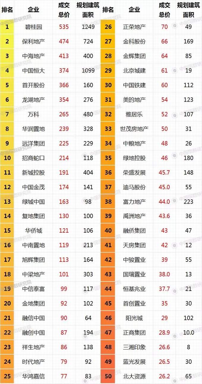 2017年1~4月全國房地產企業土地成交金額TOP50