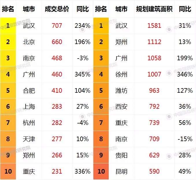 從住宅用地成交總價排行榜來看,4月份入榜地塊主要分布在一、二線熱點城市,尤以北京為主。TOP10地塊分布在北京、廣州、武漢、成都、重慶、無錫六個熱點城市,其中北京有4塊土地入榜,主要是北京政府工作報告提出加大土地供應,在“3·17”新政后土地供應不斷加大;武漢則以75.4、74.7億元奪得前兩位,兩個地塊的體量也位列當月全國土地成交面積前十。