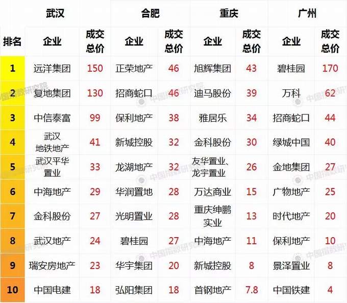 從城市成交額TOP10房企來看,全國性品牌房企成為熱點城市拿地的主力軍,占廣州、武漢、合肥與重慶超一半席位。武漢與合肥受長江經濟帶的推動,核心城市地位逐步加強,吸引了全國知名房企進駐;碧桂園、萬科與招商占據了廣州土地市場半壁江山,表現仍然搶眼;迪馬股份、金科等重慶起家的品牌房企憑借本土優勢,成為重慶土地成交TOP10企業的主力。