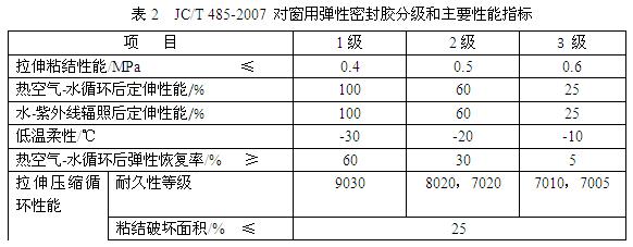 JC/T 485由于參考的是日本標準,該標準分級和性能指標與其他接縫用密封膠有很大差別,為了標準體系的統一,該標準將改為與其他接縫密封膠標準類似的分級方法。因此,國內采用該標準的產品越來越少;而且該標準中的3級產品位移能力偏低,不適用于要求較高的門窗的加工和安裝。