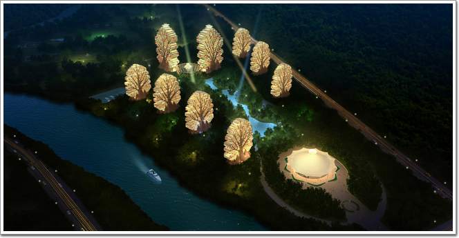 湖州馬蹄形酒店,它像一個倒U狀的馬蹄,類似于傳統(tǒng)中國畫中描繪的舊橋,很有創(chuàng)意。白天看它是一座雅致的建筑物,到了晚上開啟從地板到最高層一圈一圈的LED燈,其多變的燈光倒映到夜晚的太湖湖面上,流露出一種奢華的風情。