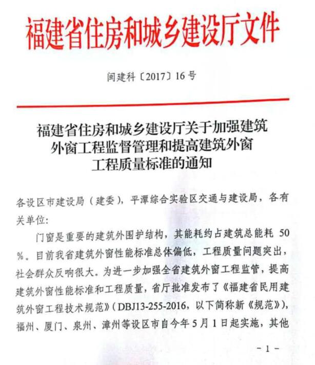 門窗是重要的建筑外圍護結構,其能耗約占建筑總能耗50%。目前我省建筑外窗性能標準總體偏低,工程質量問題突出,社會群眾反響很大。為進一步加強全省建筑外窗工程監管,提高建筑外窗性能標準和工程質量,省廳批準發布了《福建省民用建筑(詞條“民用建筑”由行業大百科提供)外窗工程技術規范》(DBJ13-255-2016,以下簡稱新《規范》),福州、廈門、泉州、漳州等設區市自今年5月1日起實施,其他設區市自2018年5月1日起實施。為指導督促各地嚴格執行新《規范》,切實加強建筑外窗工程質量標準監督管理,現將有關事項通知如下: