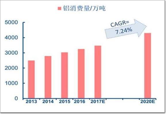 中國(guó)鋁消費(fèi)增長(zhǎng)強(qiáng)勁。 根據(jù)“十三五”有色金屬工業(yè)規(guī)劃,到 2020 年我國(guó)鋁消費(fèi)總量將達(dá)到 4300 萬(wàn)噸,2016-2020 年期間的年均復(fù)合增長(zhǎng)率(CAGR)將達(dá)到 7.24%。數(shù)據(jù)顯示,2016 年我國(guó)鋁消費(fèi)總量達(dá)到 3250 萬(wàn)噸,同比增長(zhǎng)8%,預(yù)計(jì)2017 年鋁消費(fèi)將達(dá)到 3470 噸,同比增長(zhǎng) 6.77%。