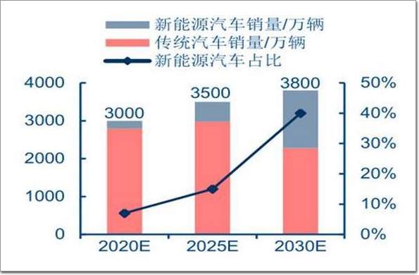 中國(guó)汽車(chē)工程學(xué)會(huì)發(fā)布的《節(jié)能與新能源汽車(chē)技術(shù)路線圖》明確提出,2020 年、2025年和 2035 年,汽車(chē)年產(chǎn)銷(xiāo)規(guī)模將分別達(dá)到 3000 萬(wàn)輛,3500 萬(wàn)輛,3800萬(wàn)輛,其中新能源汽車(chē)的銷(xiāo)量占比將分別達(dá)到 7%、15%、和 40%。