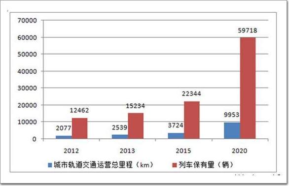 預(yù)計(jì)到2020 年中國(guó)城市軌道交通列車(chē)保有量將達(dá)到 6 萬(wàn)輛 ,從2015 至2020 年平均年需求量為7000輛左右。通常城市軌道列車(chē)密度是每公里配置 6-7 輛車(chē),按照6 輛的保守計(jì)算,2015 年城市軌道列車(chē)保有量為 22344輛;中國(guó)城市軌道交通協(xié)會(huì)測(cè)算,2020 年城市軌道營(yíng)運(yùn)里程數(shù)約9953 公里,列車(chē)保有量為 59718 輛。