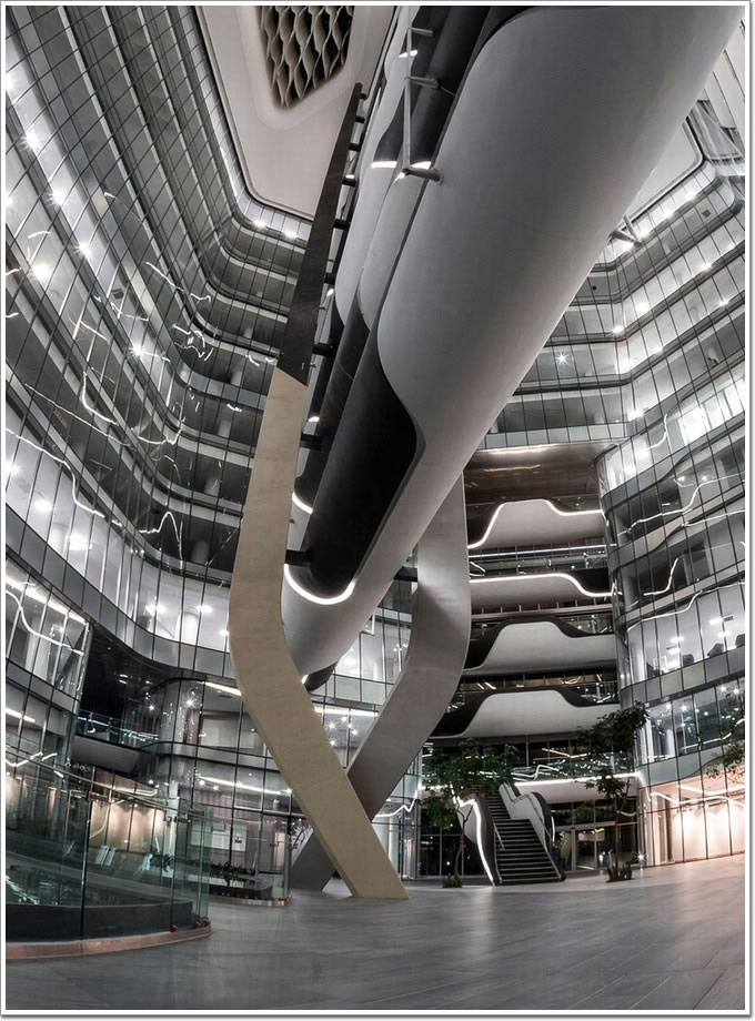 項(xiàng)目外形上極為獨(dú)特,主體上分支出幾片類似葉片狀的獨(dú)立空間,使其功能分區(qū)明確,在葉片尾部雙曲面玻璃幕墻打造成流暢圓弧狀,使其整個(gè)建筑看上去不那么“鋒利”,其次,整個(gè)外立面采用了混塔手法,由玻璃幕墻和金屬幕墻混合而成,這樣的處理手法使期整個(gè)幕墻立面層次分明,生動(dòng)而充滿活力。