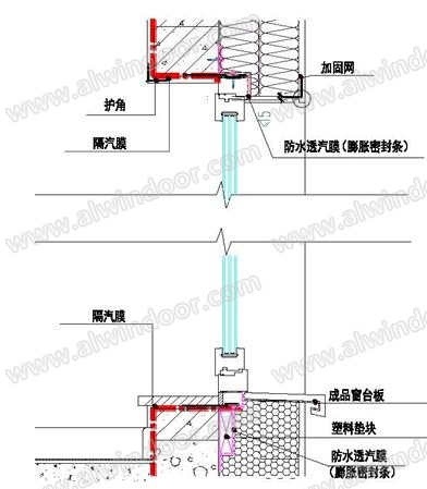 (4)外窗臺應(yīng)設(shè)置窗臺板,以免雨水侵蝕造成保溫層的破壞;窗臺板應(yīng)設(shè)置滴水線;窗臺宜采用耐久性好的金屬制作,窗臺板與窗框之間應(yīng)有結(jié)構(gòu)性鏈接,并采用密封材料密封;