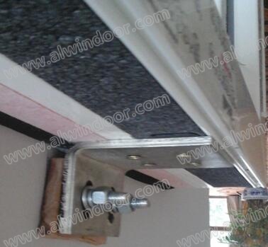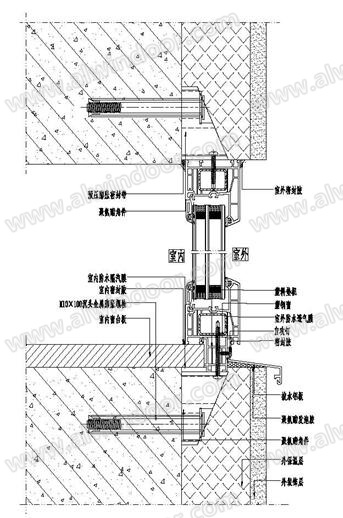 圖五是鋁合金窗溫法無熱橋安裝方式,下部采用了角形帶墊框聚氨酯拉擠型材支架,承擔(dān)門窗的重力荷載,其它三邊采用聚氨酯拉擠型材制作固定直角角件,承擔(dān)門窗承受的風(fēng)荷載,采用沉頭金屬膨脹螺栓或尼龍脹錨螺栓將聚氨酯拉擠型材支架或固定角件固定在建筑墻體上,外露的螺栓頭采用塑料蓋帽蓋住,不使金屬熱橋外露。