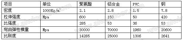 聚氨酯型材具有輕質(zhì)高強(qiáng)的優(yōu)良性能(詳見下表),聚氨酯附框不需鋼框為骨架,完全靠自身就能支撐,抗壓、抗折、不變形、不彎曲。既節(jié)省了鋼材,又達(dá)到了使用目的,可在臺風(fēng)多發(fā)區(qū)使用。