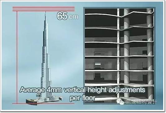 由于“迪拜塔”建成之后的重量達(dá)到500,000噸,會出現(xiàn)下沉的趨勢。所以在建設(shè)過程中,每一層的實際高度比設(shè)計高度高出4毫米。