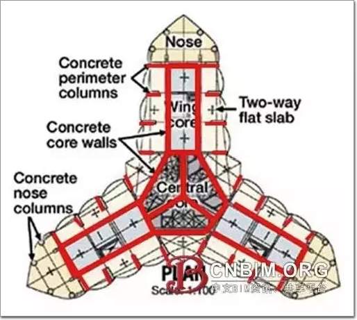 全鋼結(jié)構(gòu)優(yōu)于混凝土結(jié)構(gòu),適合于超高層建筑,這是上世紀(jì)六七十年代的普遍共識,并建造了大量300m以上的鋼結(jié)構(gòu)高層建筑。到八九十年代,純鋼結(jié)構(gòu)已經(jīng)不能滿足建筑高度進一步升高的要求,其原因在于鋼結(jié)構(gòu)側(cè)向剛度(詞條“剛度”由行業(yè)大百科提供)的提升難以跟上高度的迅速增長,此后鋼筋混凝土(詞條“鋼筋混凝土”由行業(yè)大百科提供)核心筒加外圍鋼結(jié)構(gòu)就成為超高層建筑的基本形式。而哈利法塔做了前所未有的重大突破,采用了下部混凝土結(jié)構(gòu)、上部鋼結(jié)構(gòu)的全新結(jié)構(gòu)體系。即-30~601m為鋼筋混凝土剪力墻體系,601~828m為鋼結(jié)構(gòu),其中601~760m采用帶斜撐的鋼框架。