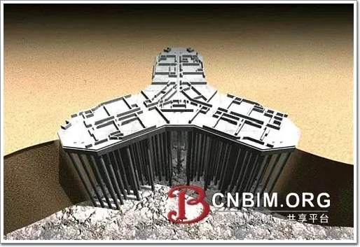 基礎(chǔ)設(shè)計采用摩擦樁加筏板聯(lián)合基礎(chǔ)(見圖5)。該工程地基為膠結(jié)的鈣質(zhì)土和含礫石的鈣質(zhì)土。天然地基土與混凝土樁的表面極限摩擦力為250~350kPa。194根現(xiàn)場灌注樁,長度約43m,直徑1500mm,設(shè)計承載力為3000kN。現(xiàn)場進行壓樁試驗,最大壓力為6000kN,樁尖深度 -70m。迪拜地下水具有腐蝕性,氯離子濃度4.5%,硫0.6%,因此樁采用C60混凝土,加25%粉煤灰,7%硅粉,水灰比0.32,坍落度675mm。