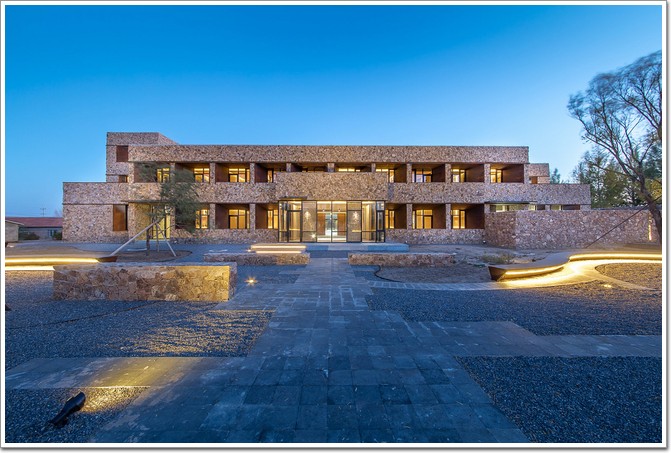 而立面的窗口飾面使用了耐候鋼板,隨著時間的推移,耐候鋼板體現了時間與歷史感,同時讓整個立面隨時間變化,像是一個隨時間不斷生長的有機體。其次,內部空間還運用了夯土效果的裝飾涂料,夯土涂料的原料同樣就地取材于當地的黃土,十分環保。同時具有良好的保溫隔熱效果,節能、透氣性能強。涂料選定為赭黃色,以形成自然質感的內墻表皮形式,與內蒙的大地相適應。