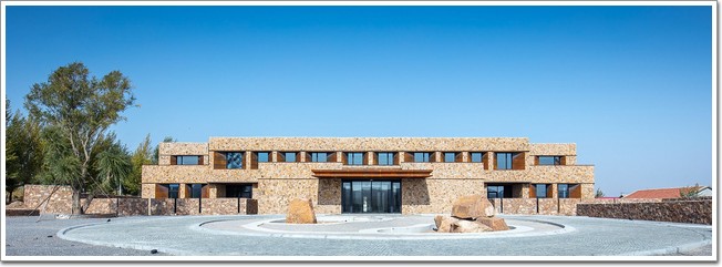 最后則是建筑的外觀,外部簡潔粗獷,與周邊天然遼闊的地理環境相呼應。設計師嘗試用現代的設計語言來闡述設計本身,整座建筑使用了具有鮮明特征的當地石材和耐候鋼板,以石筑墻,是向敖漢上古先民致敬,以鋼為材,是向鑌鐵的契丹致意。而石頭材料則來自于敖漢當地,源于基座建設時挖掘而出的石塊,將這些石塊鑲嵌于墻體,既消化了富余的土方量又產生出原汁原味的鄉土景觀。山劈石呈赭石色,有黃色和灰色的花紋,石頭表面肌理豐富,凹凸明顯,表情粗獷,充分模擬了自然,賦予建筑粗獷的美。